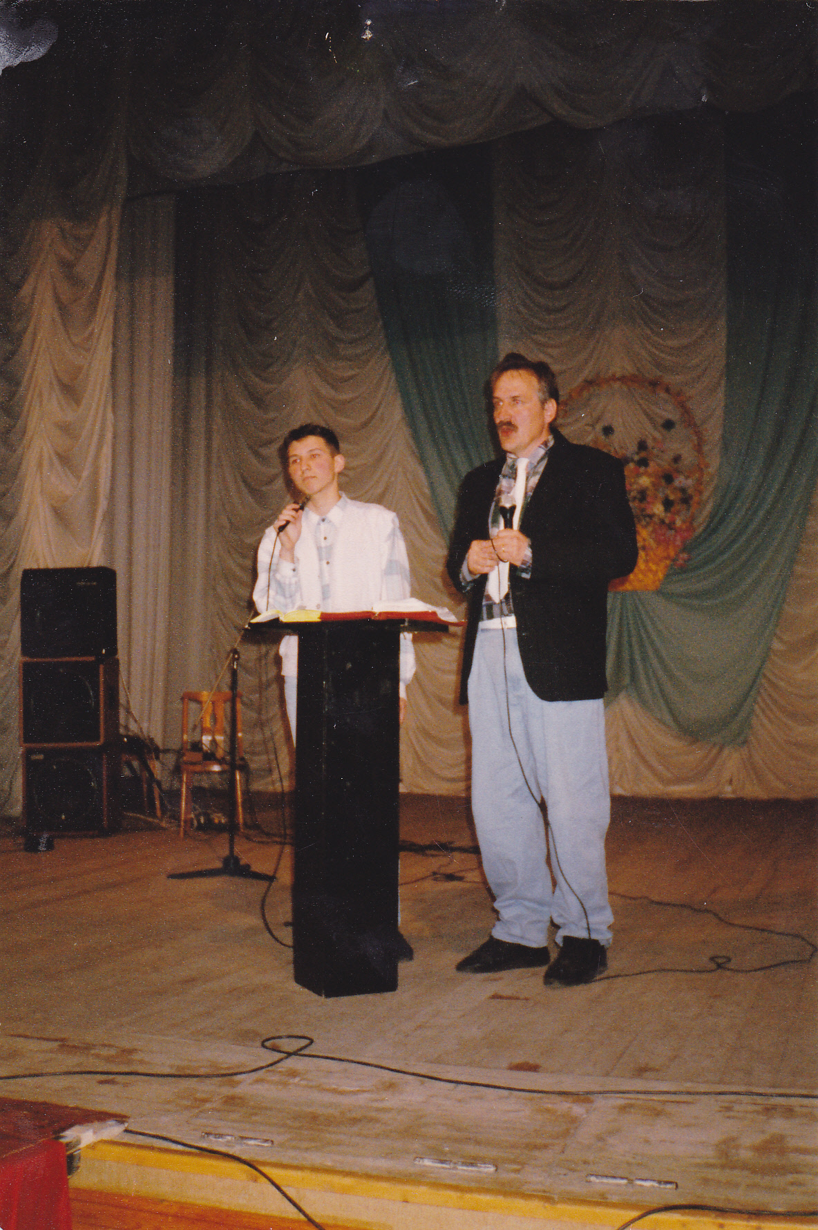 kuva 1 Mikko ja tulkki Jura puhuvat Sirpa todisti ja Airi kertoi matkoista ja kotimaan työstä, Petri lauloi koskettavasti. Tilaisuudessa oli nainen, jonka puolesta rukoilin erityisen paljon viime lokakuun matkalla, ks. edellinen matkakertomus. Nainen säteili onnea. Hän kertoi että Jumala oli parantanut hänen kovan migreeninsä ja kätensä. ”Kaikki tuntui yhdentekevältä ja päätin lopettaa elämäni. Seisoin ikkunan vieressä ja katselin alas. Äkkiä jokin lämmin virta juoksi sisälläni, se kosketti päätäni ja käsiäni. Tunsin heti että se on parantava voima. Kiitos Herralle! Nyt olen voinut palata entiseen toimeen ja voin käsilläni palvella seurakuntaa.” Ihmeellistä! Jumalalle on kaikki mahdollista. Pohjois-Venäjällä töitä on niukasti. Nuorisopast. Andrej pyysi, jos voisin auttaa 2 kk:ksi töihin Suomeen kesällä. Lupasin kysellä. Annoin hänelle osoitteita ja pienen suomi/venäjä sanavihkon. Mäkisen Tapolla on varmaan enemmän yhteyksiä työnantajiin. Minunkin tuttavapiirissäni on mm gideoneita yrittäjinä.