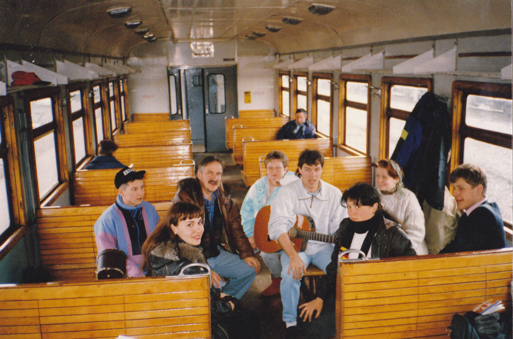 kuva 3. Evankeliointiryhmä venäläisessä junassa Junalippu maksoi 7500 ruplaa, siis noin 7.5 mk suunta. Kylässä on 120 ihmistä ja pidimme evankeliointikokouksen. Sirpa, Petri, Jura ja Tania lauloivat junassa opettelemaansa Kanadan Petrin bravuuria: I don’t want asleep. Sirpa todisti ja Airi kertoi avustus-ja hoitotyöstään sekä matkastamme. Itse puhuin: ” Samana päivänä, viikon ensimmäisenä, myöhään illalla, kun opetuslapset olivat koolla lukittujen ovien takana, juutalaisten pelosta, tuli Jeesus ja seisoi heidän keskellään ja sanoi heille: "Rauha teille!", Joh. 20:19. Venäläisiä kuulijoita oli n. 50 ja paljon lapsia mukana. Saarnapuheen lopuksi kysyin: ”Kuka haluaa uskoa syntinsä anteeksi Jeesuksen nimessä ja veressä?” Ainakin 40 ihmistä nosti kätensä. Kiitos Herra voitetuista sieluista! Täällä on herätystä! Tanja lauloi koskettavasti lapsille. Hänellä on erikoisen valloittava kyky saada lapset ja aikuiset mukaan lauluihin ja leikkeihin. Teimme kaksi evankeliointiryhmää ja vierailimme taloissa. Ihmiset kertoivat toiveistaan ja ongelmistaan. Kohtasimme erään nuoren miehen, joka keskustelun jälkeen rukouksessa vastaanotti Jeesuksen elämänsä Herraksi. Toisen ryhmän vierailukohteessa eräs vanha aviopari oli myös kääntynyt rukouksessa Jeesuksen seuraajaksi. Menomatkalla lauloimme junamatkustajille. Eräs armeijasta kotiin Muurmanskiin palaamassa ollut nuori sotilas antoi nimiä täynnä olevan lakkinsa laulaja- Petrille. Myös Aaro sai lahjan ja minäkin. Tämä matka oli voimakas Pyhän Hengen isku Kristuksessa Saatanan joukkoja vastaan. Kiitos Jeesus!